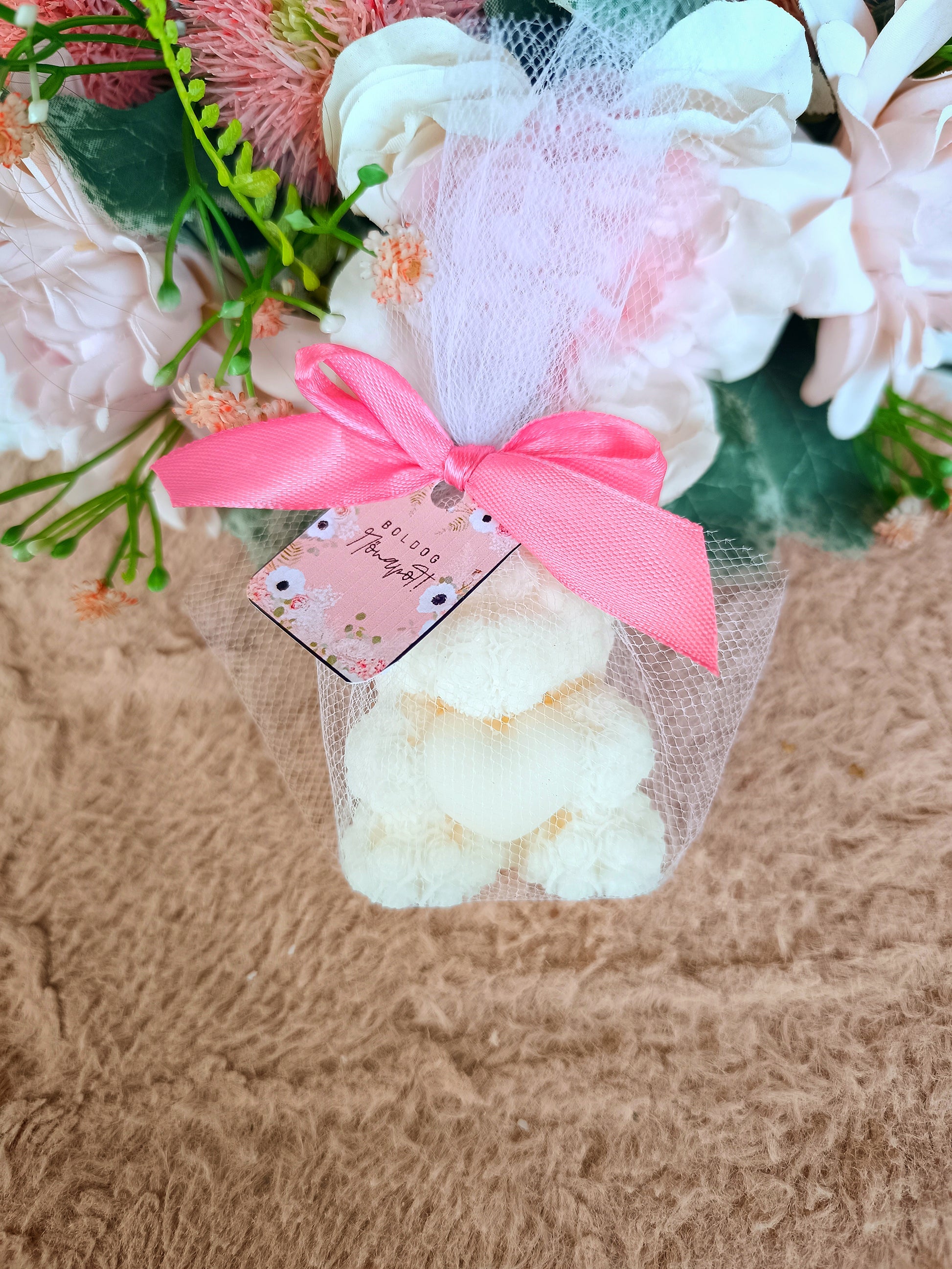 Ajándék Nőnapra maci szívvel gyertya csomagolásban egyedi kártyával