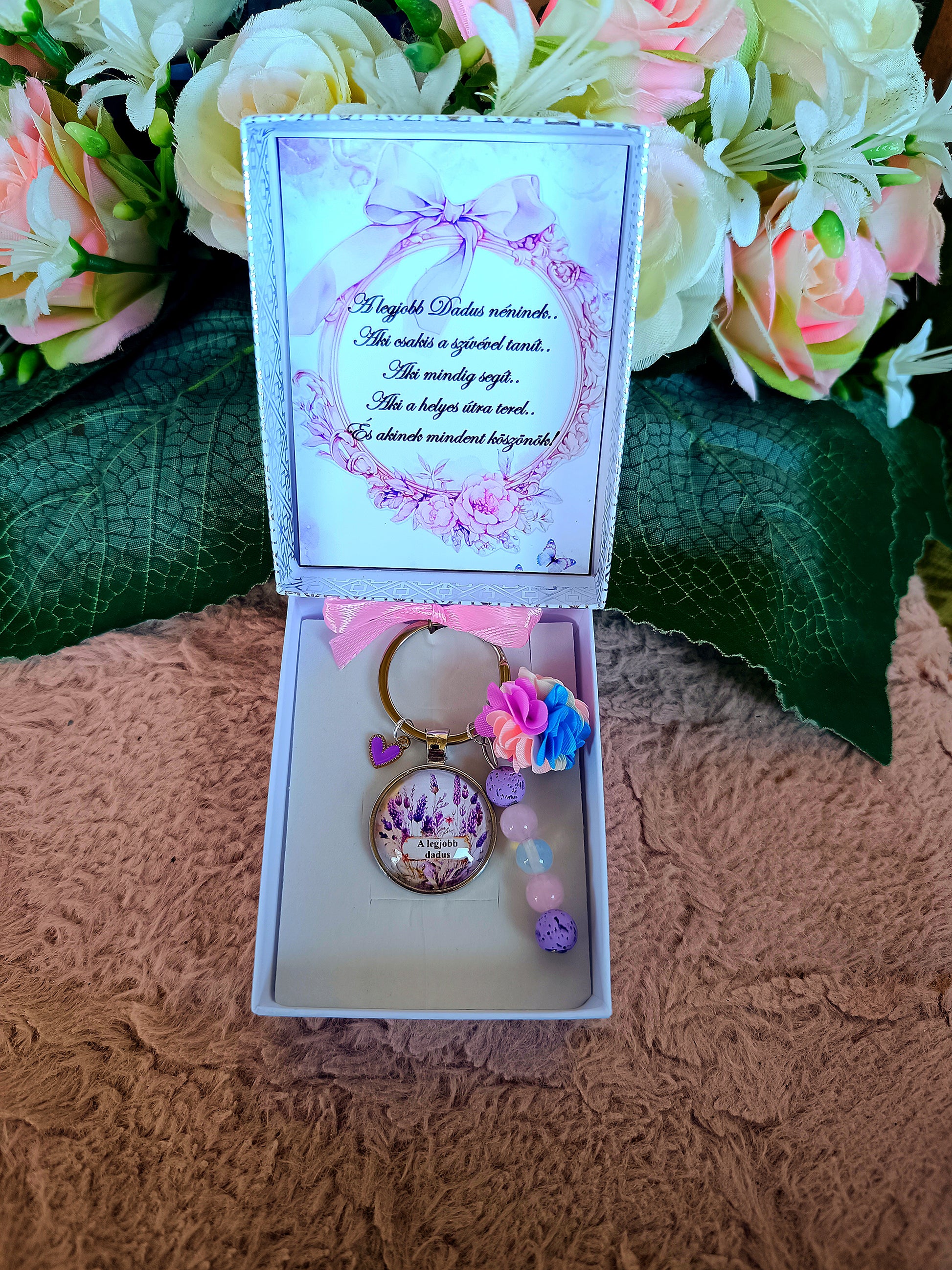 Ajándék pedagógusnak, dadus egyedi kulcstartó lila levendulás
