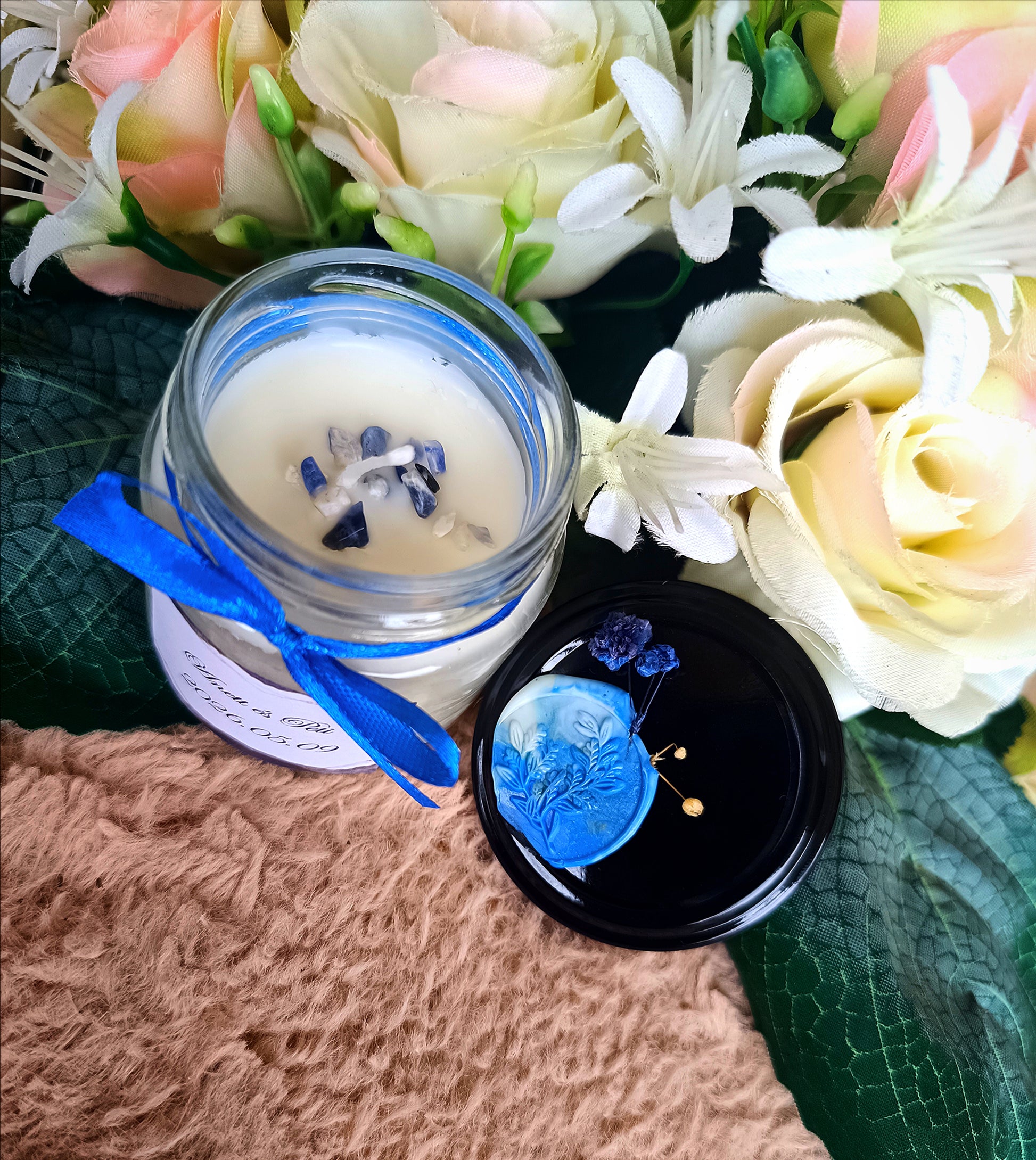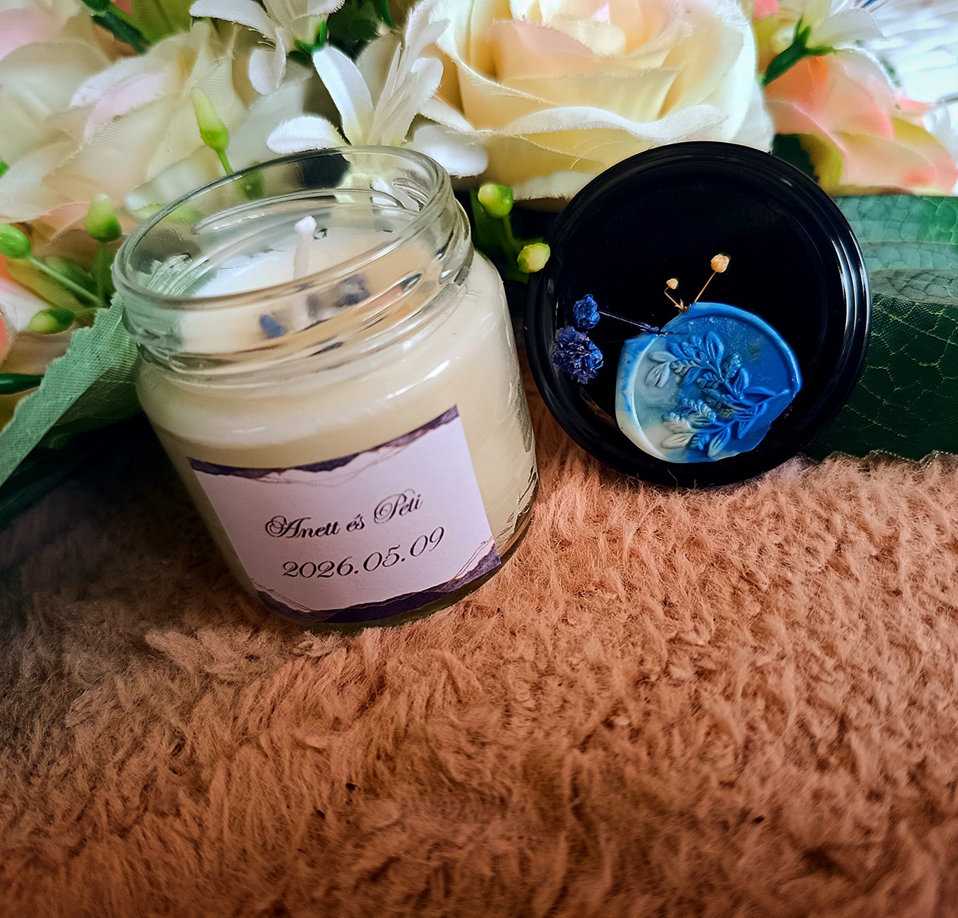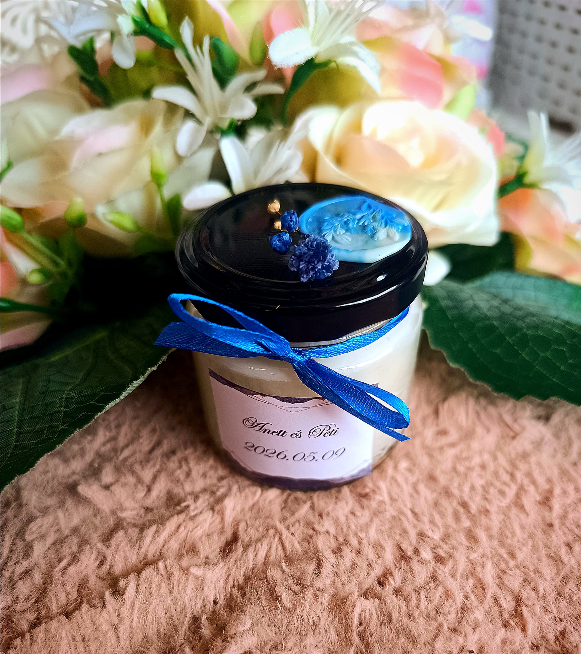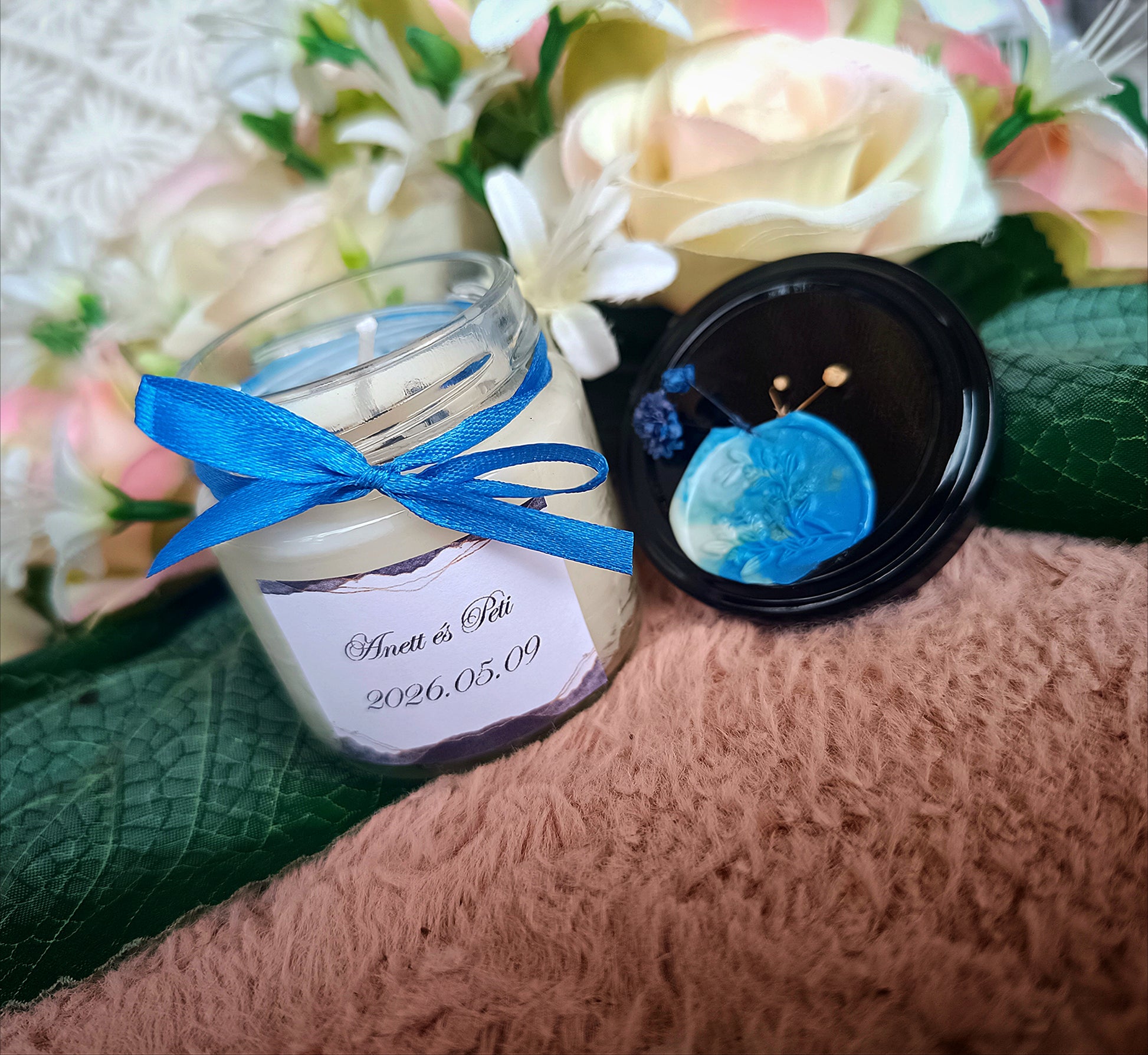 Eküvői köszönő ajándék vendégeknek feliratos ásvány gyertya kék
