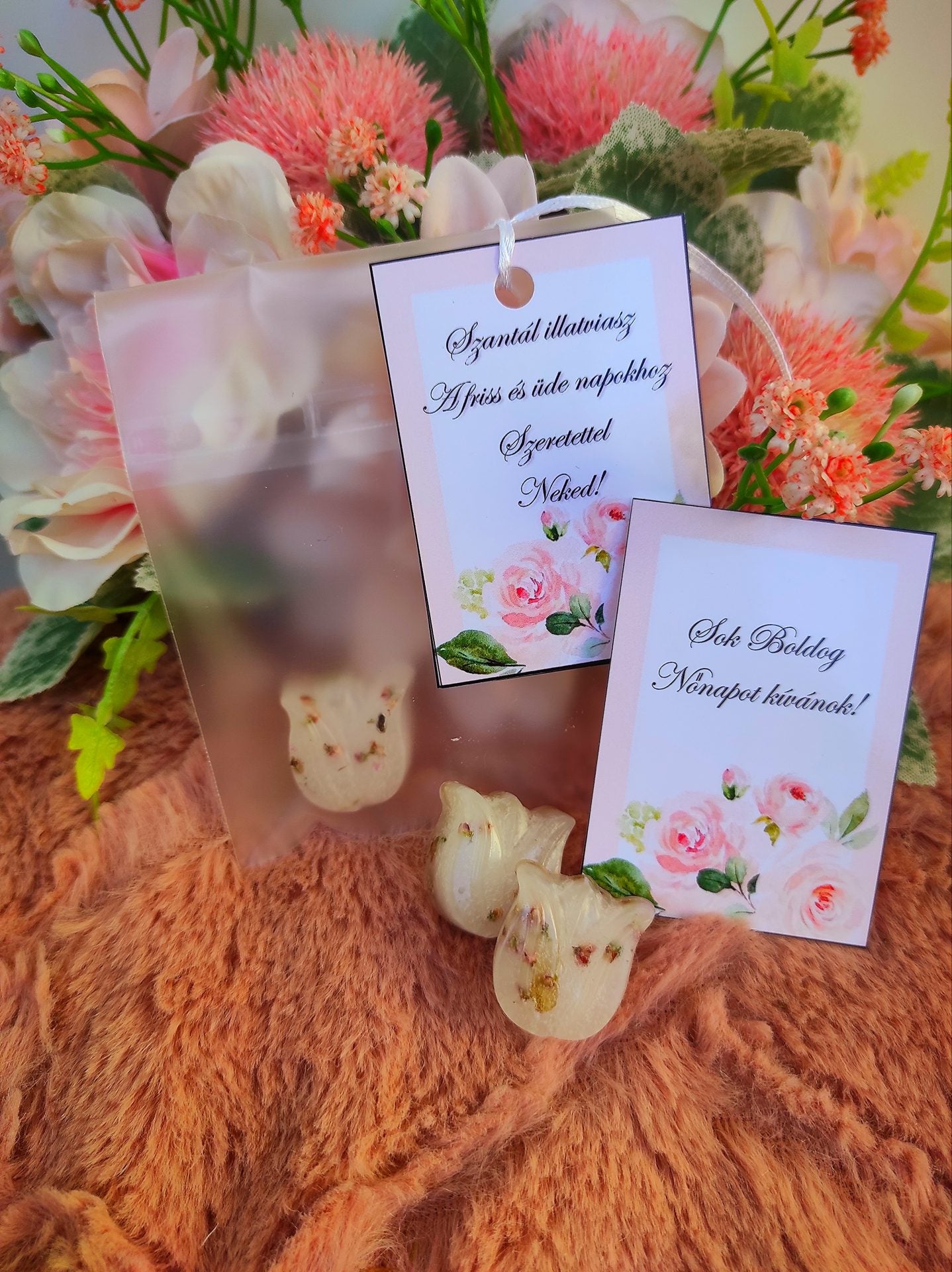 Nőnapi ajándék szantál illatviasz Illata: választható Ajándék csomagolásban kerül küldésre. A csomag tartalmazza: 1 db illatviasz + illatviasz kártya, használati utasítás, nőnapi köszöntő kártya (3db kártya) + csomagolás Illatviasz használata: Helyezd a viaszt a viasz olvasztó tálba, majd az aljába tégy egy teamécsest, majd óvatosan gyújtsd meg és élvezd a kellemes illatot.