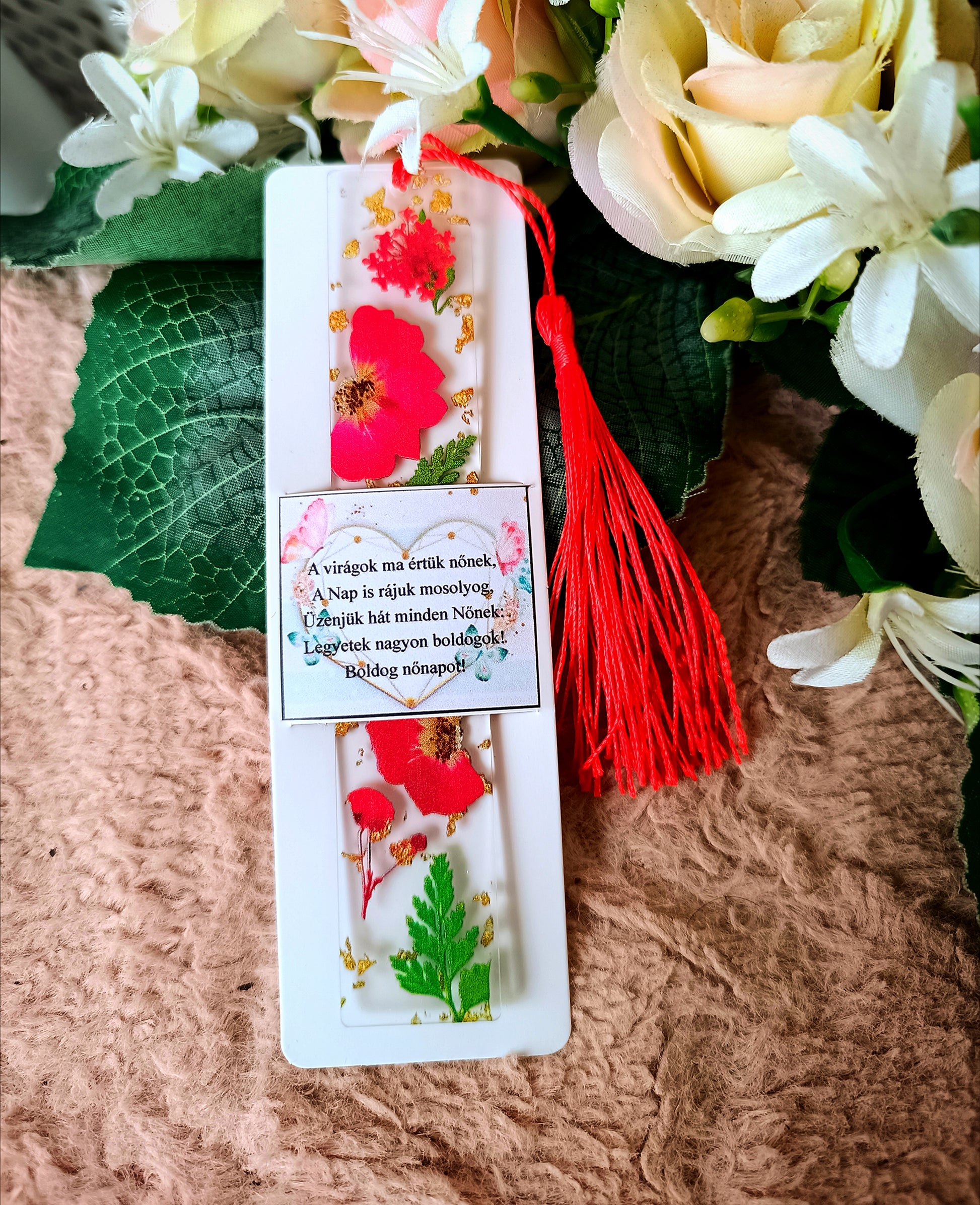 Nőnapi ajándék virágos könyvjelző piros